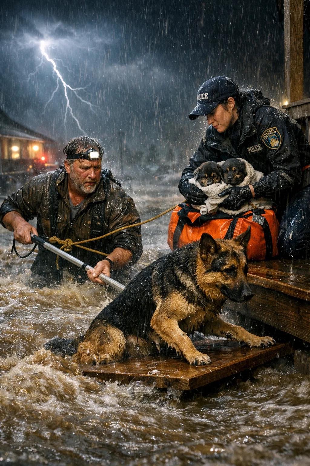 A Texas veteran saw floodwaters rapidly rising, then noticed a desperate mother German Shepherd balancing on a drifting plank while protecting her two tiny puppies, a dramatic moment of survival and instinct amid the dangerous fast moving storm floodwaters surge.