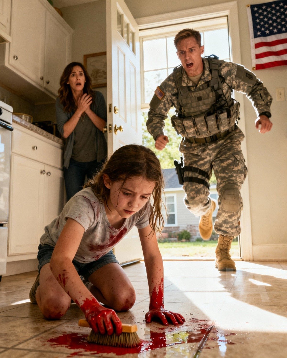Ella’s head shot up. Her father, Sergeant Daniel Parker, stood in the doorway, his military uniform dusty from a week-long deployment. His eyes widened at the scene before him — the blood, the exhaustion, the tiny figure collapsed on the kitchen floor.