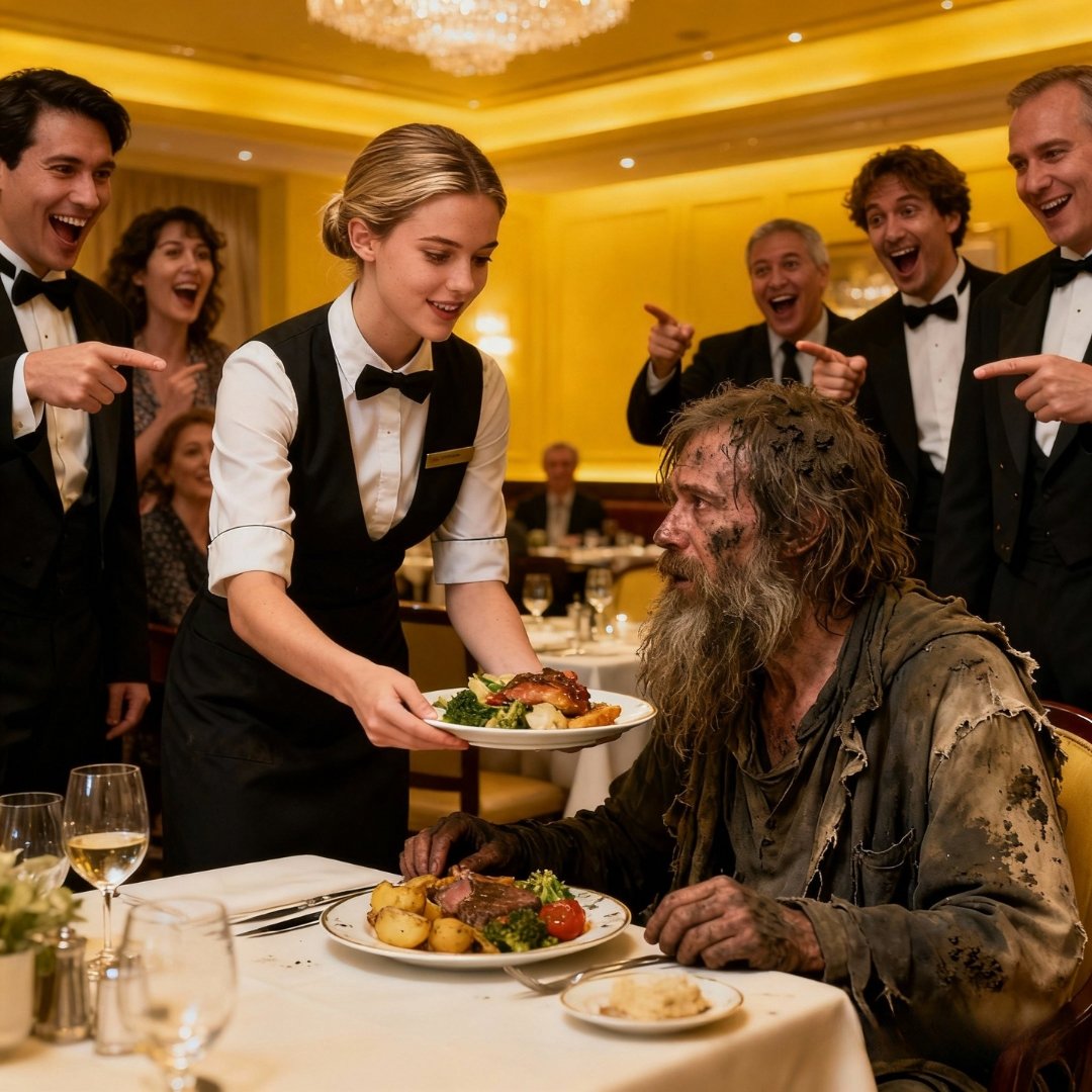 The hostess rolled her eyes. “Of course,” she snapped. “Look, sir, there’s a shelter down the block. We’re not a soup kitchen.”