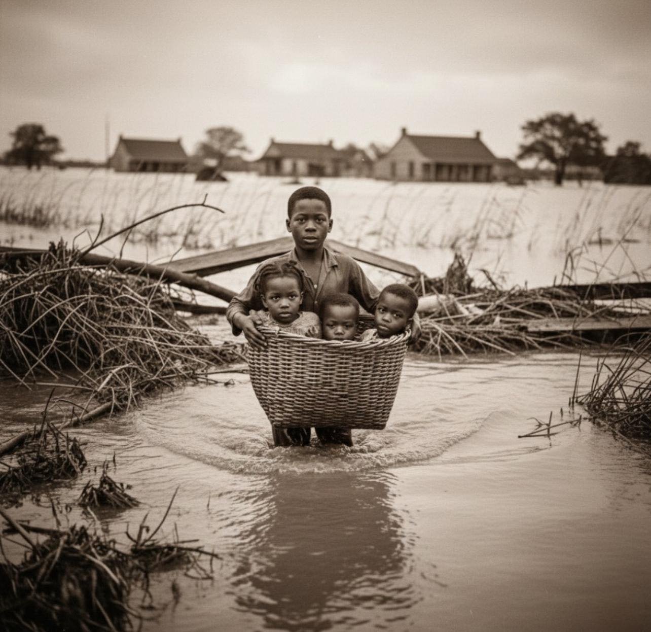 One warm spring afternoon, dark clouds gathered without warning. Heavy rain poured down, and the Delta’s river swelled at a terrifying speed. Before the adults realized the danger, the rising water swept through the fields and rushed toward the Carter home. Elijah’s little sister and two young cousins had been playing in the yard and were suddenly stranded on a small rise just inches from being swept away.