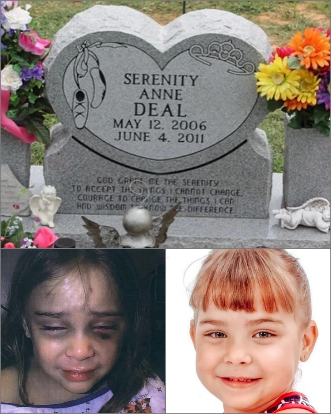The grandparents visit her grave often, leaving flowers, small stuffed animals, and drawings — the kinds of things Serenity used to love.
