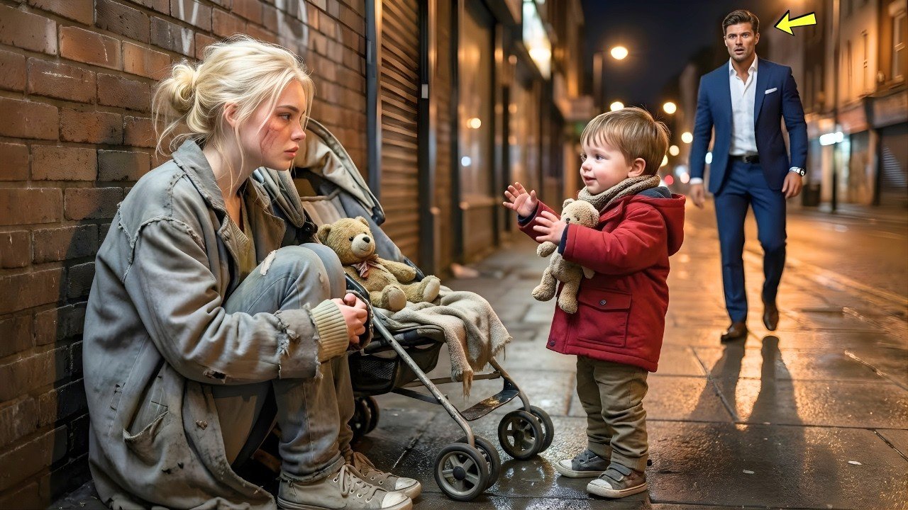 This wasn’t the version of himself people met in boardrooms. This was someone else, a man with questions and a hope he was almost afraid to name. He spotted her in the usual place, sitting on the curb beside the rusted stroller. Same coat, same messy hair, same bear in her arms. She was murmuring softly, rocking slightly, not noticing him at all.