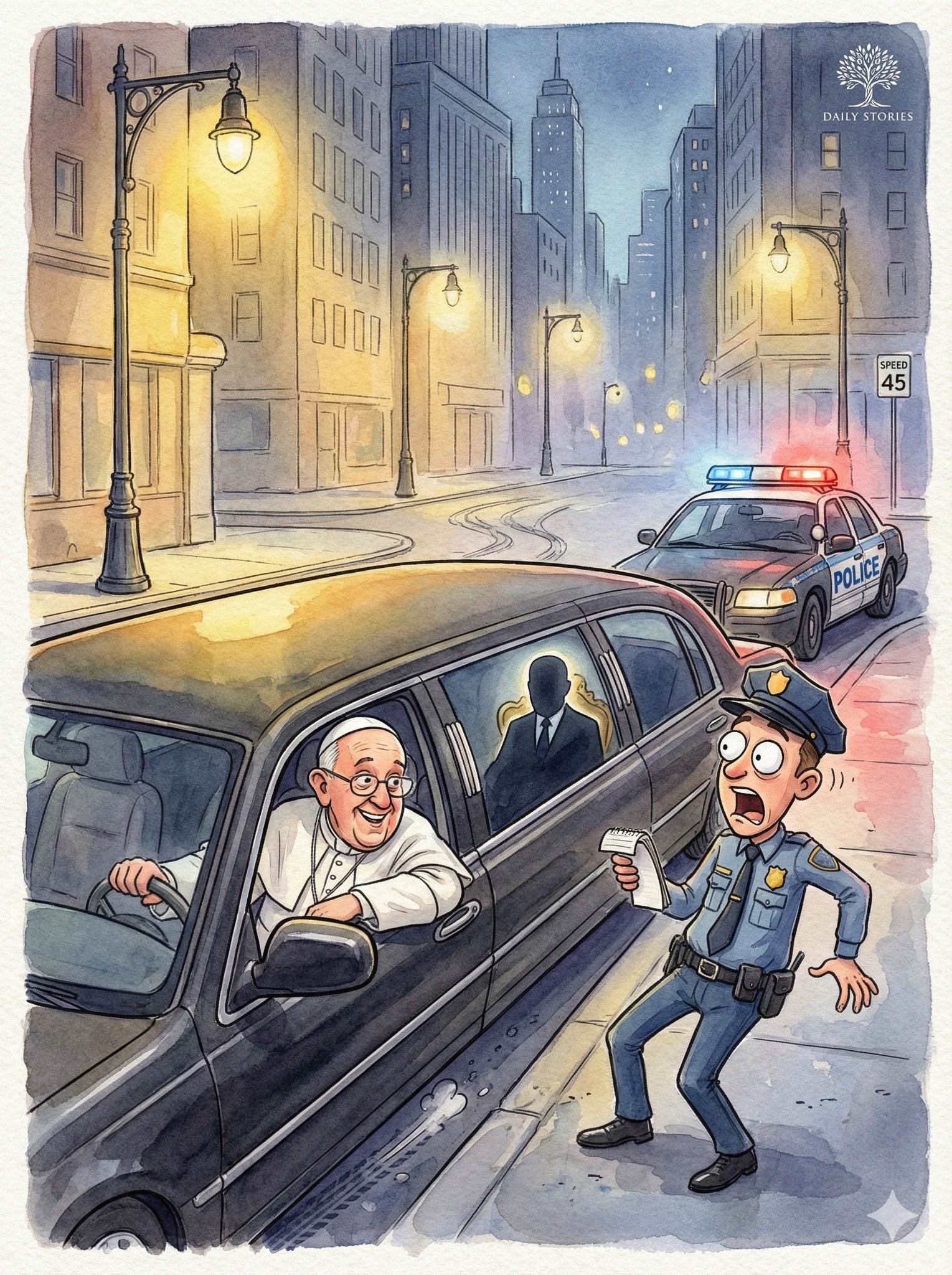 Soon, a police car pulls up beside them and signals for the limo to stop. The Pope slams on the brakes, coming to a screeching halt, with the police car following suit.