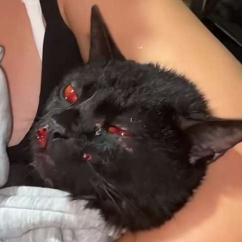 Emma dropped to her knees, her hands shaking as she reached for Luna. Her cat’s eyes were bloodshot, the fur on her face matted with dirt, and her body covered in wounds. Luna’s once glossy black coat was now dull and patchy, her tiny frame too thin. Emma couldn’t hold back the tears that flooded her eyes. Each tear that fell was a mix of relief and pain. Relief that her cat was finally home, but a deep, gut-wrenching sorrow at the sight of her suffering so much.