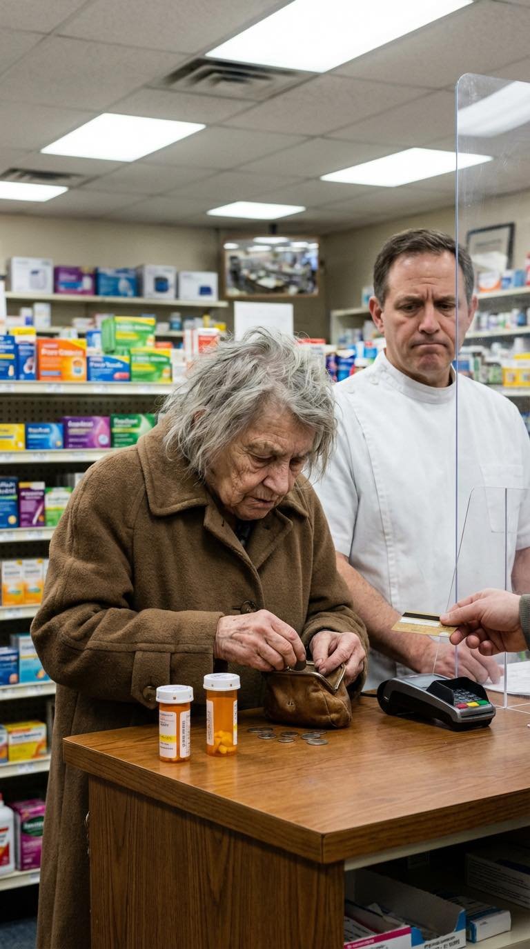 It was early evening at a chain pharmacy wedged between a discount pet supply store and a tax prep office, the kind of place that tries to feel welcoming with seasonal candy displays and glossy posters of smiling seniors playing pickleball, and I was third in line at the prescription counter, scrolling through emails on my phone, half calculating whether I could stretch what was left in my checking account until the following Friday, when I noticed the woman ahead of me clutching her purse with both hands as if it were something that might float away if she loosened her grip.