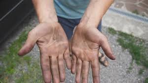 Immediately after a demanding shift, a worker’s hands may show visible traces of the day’s labor despite proper hygiene practices.