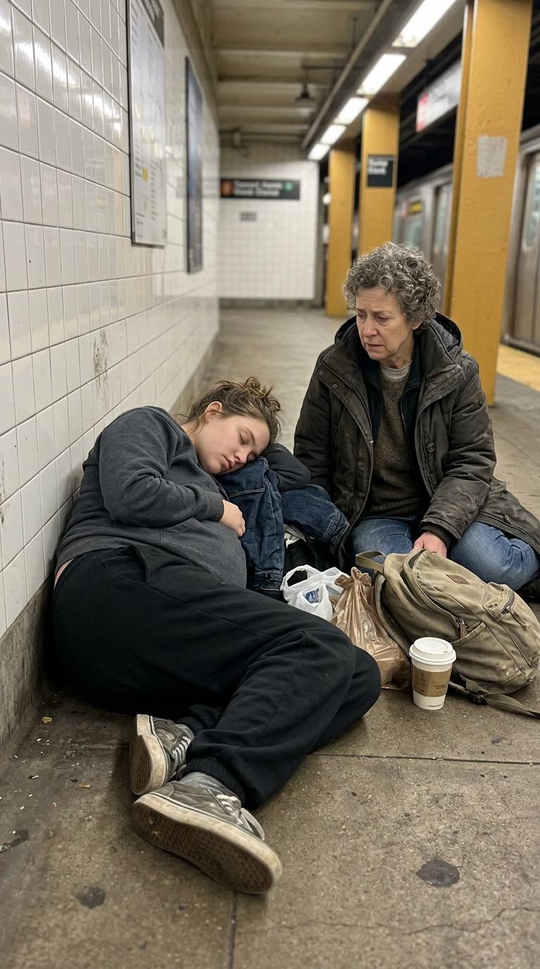 That’s when I noticed a woman sitting on the ground near a pillar, wrapped in a worn coat, shoulders shaking slightly.
