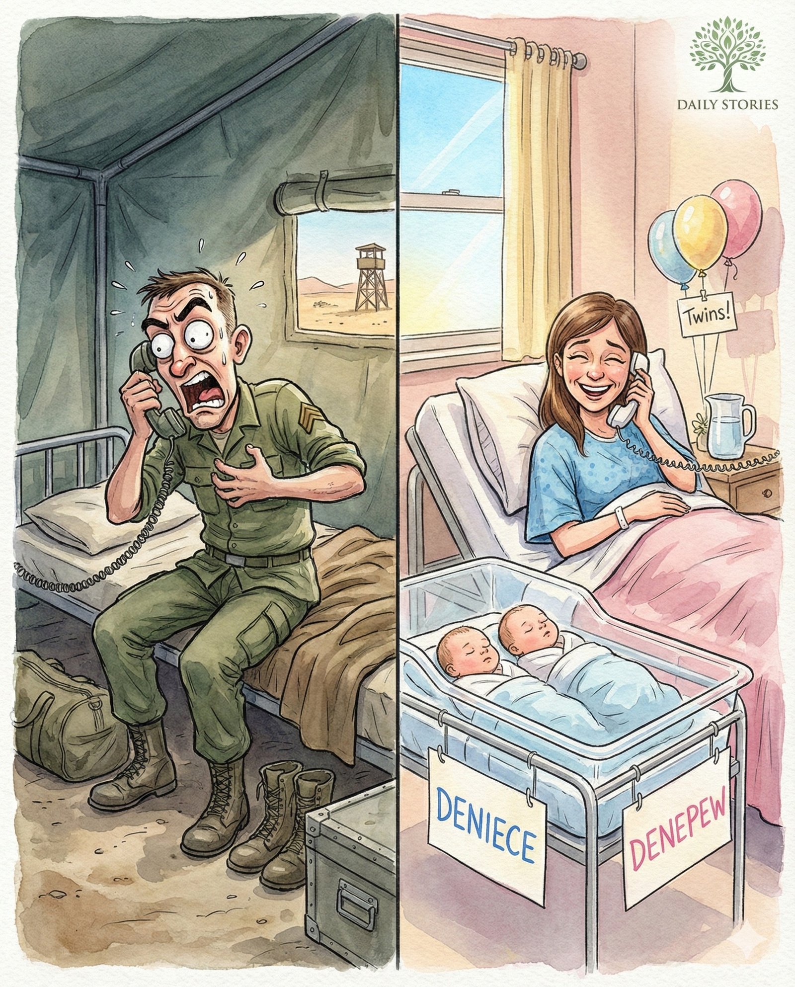 The next day, he got the news that his wife had delivered twins. He got to a phone and called her right away. “Oh honey,