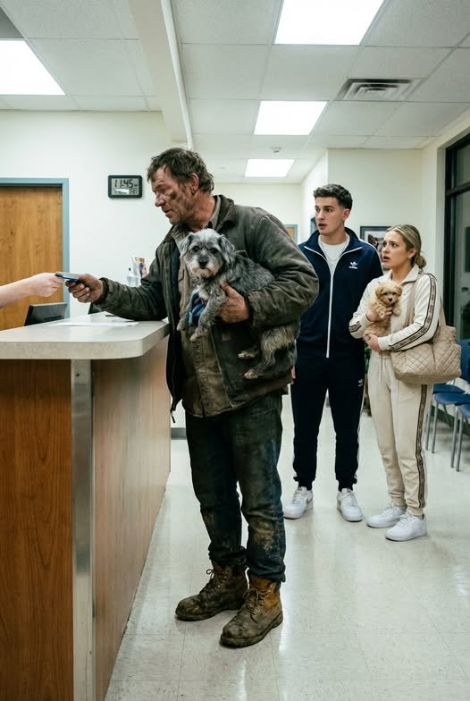 Two people who looked like they’d stepped out of a fitness magazine: matching white hoodies, spotless sneakers that probably cost more than my entire work uniform, and a tiny golden puppy tucked inside a designer carrier.