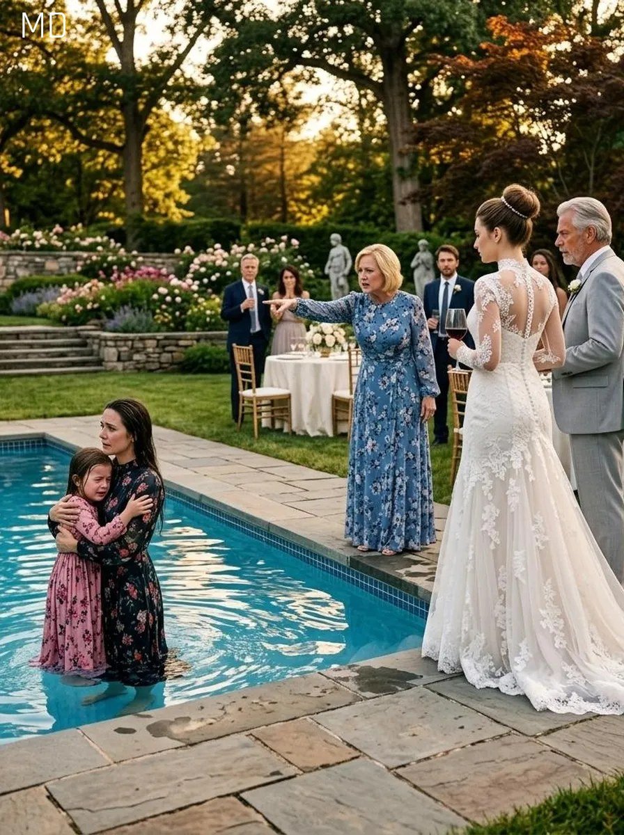 I arrived at my sister Chloe’s wedding already knowing my place—quietly seated at a distant table, far from the spotlight, with my young daughter Lily beside me. While the celebration sparkled for everyone else, I felt the familiar weight of being overlooked. My mother’s sharp remarks and cold glances made it clear she still saw me as someone who didn’t measure up. I stayed calm, focusing on Lily, reminding myself that I was there for a moment that mattered. But when a small accident led to tension and embarrassment, the situation escalated quickly. Harsh words were spoken, and in a moment that felt both surreal and painful, Lily and I ended up soaked in the fountain, surrounded by uneasy laughter and silence that said more than any words could.