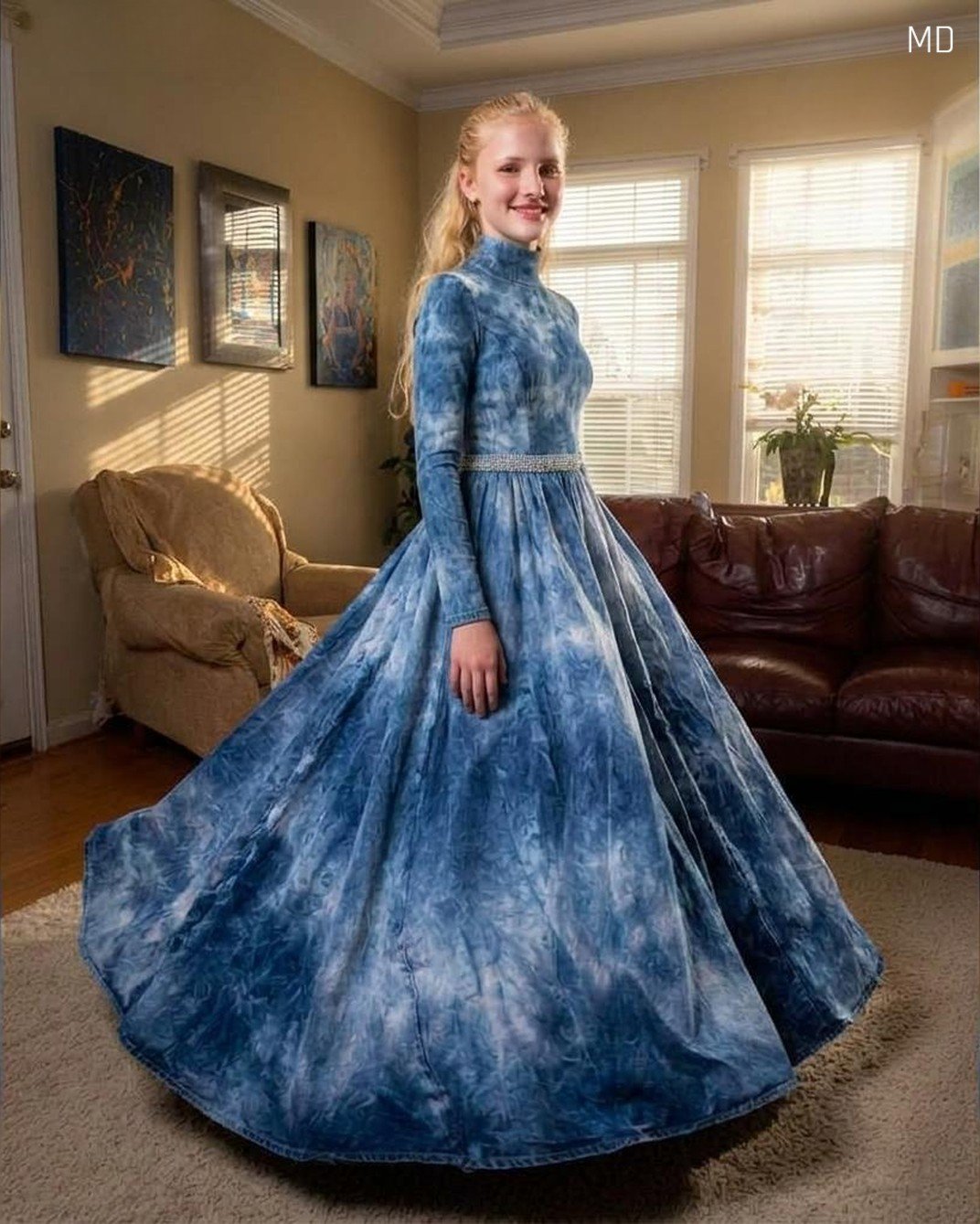 A couple of days later, Noah came into my room holding a pile of our mom’s old jeans. He looked nervous but determined. “Do you trust me?” he asked. He had taken a sewing class the year before, and though neither of us knew exactly what would happen, I said yes. Together, in quiet moments when the house felt less heavy, he worked on something I couldn’t fully imagine yet. When he finally finished, I stood in front of a dress made from pieces of denim stitched together with care. It wasn’t just beautiful—it felt like a piece of our mom was still with us, woven into every seam.
