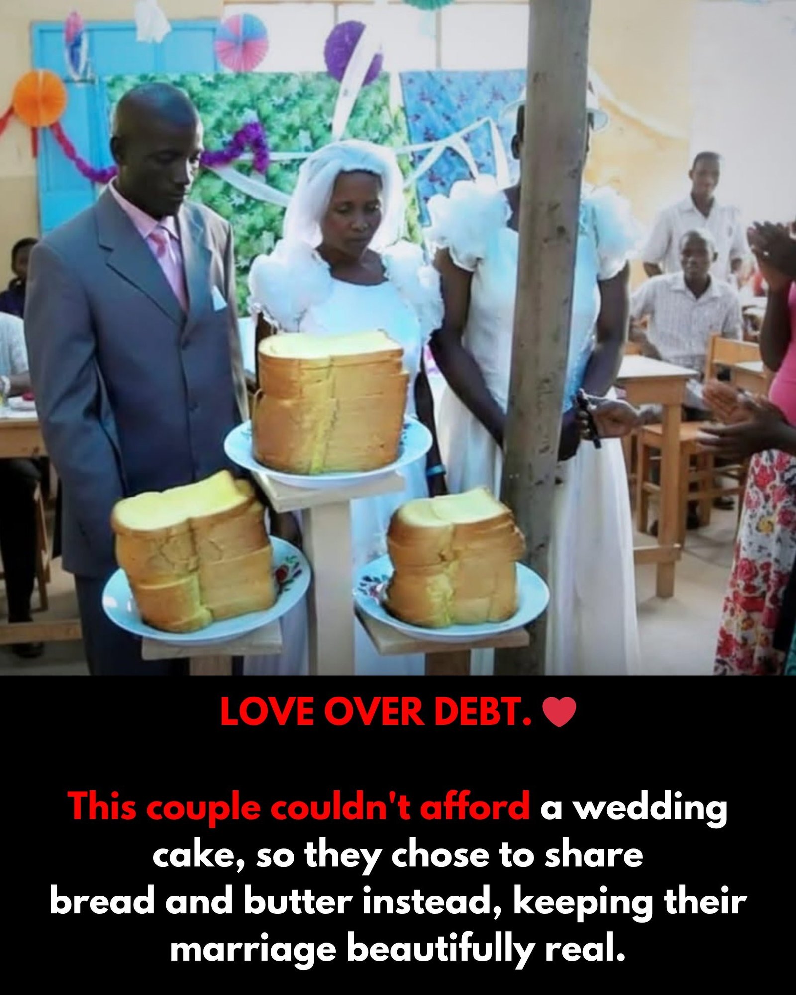 The image captures a touching moment from a wedding ceremony where a couple opted for a profoundly symbolic replacement for the traditional expensive tiered cake. Unable to afford a conventional wedding cake, the bride and groom instead chose to share and serve slices of plain bread and butter to their guests.