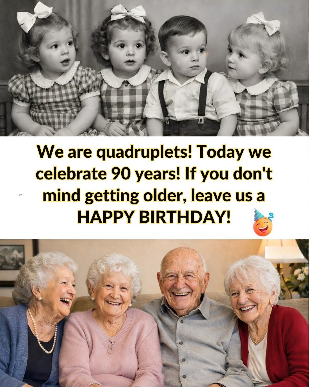 Here’s to 90 years of memories, love, and the best kind of family—one that will always be there, no matter what. Happy Birthday to Jane, Alice, John, and Grace, the quadruplets who have shown us all the true meaning of family.