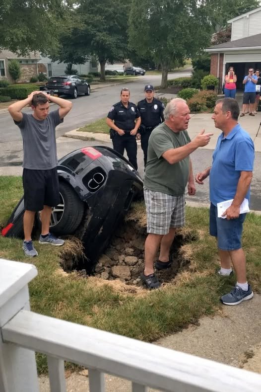 The ground gave way in an instant, swallowing the front of the Lamborghini with a sound that was less a crash and more a sudden ending, carbon fiber meeting reality in a sharp, final punctuation that echoed down the street, followed by silence broken only by the hiss of escaping fluid and a single, furious shout.